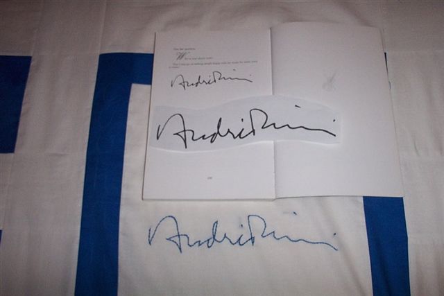 and cut out the pieces. The first thing I made was Andre’s square, and decided to use his signature instead of printing