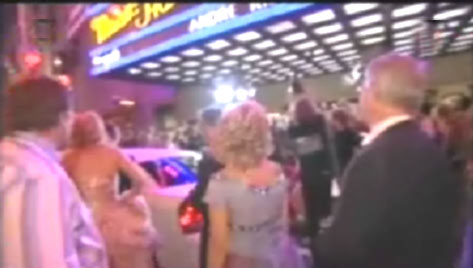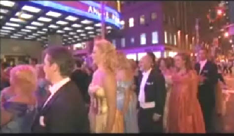 We see pictures of the entrance: the limo is in front of the Radio City Music Hall, and the orchestra members jump in