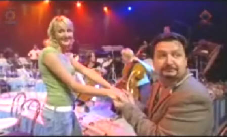 Bela is singing a love song (?) for Linda Custers, holding her hands. Linda acts