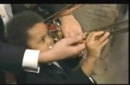 René Henket (trumpet) is crossing the street in front of the Radio City Music Hall. He says: Does it not look great,