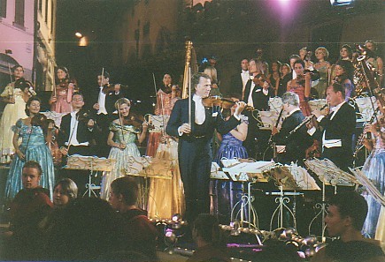 several places in the audience himself. They start a waltz, he makes a joke. The orchestra