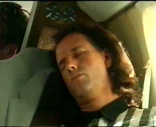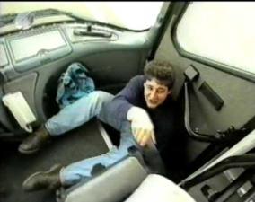 back of the bus to the front, where he falls into the stairwell saying: “Is this far
